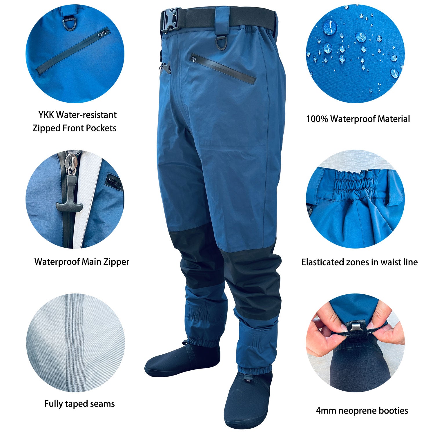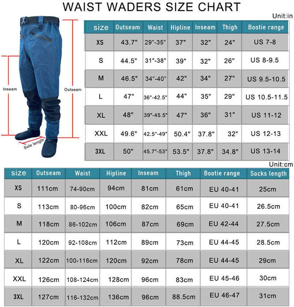 Waterproof main zipper with with outer protective flap,2 exterior pockets with a YKK water resistant zipper.Elasticated zones in waist line,keep waist wader fit your waist.wading belt and repair kit include.