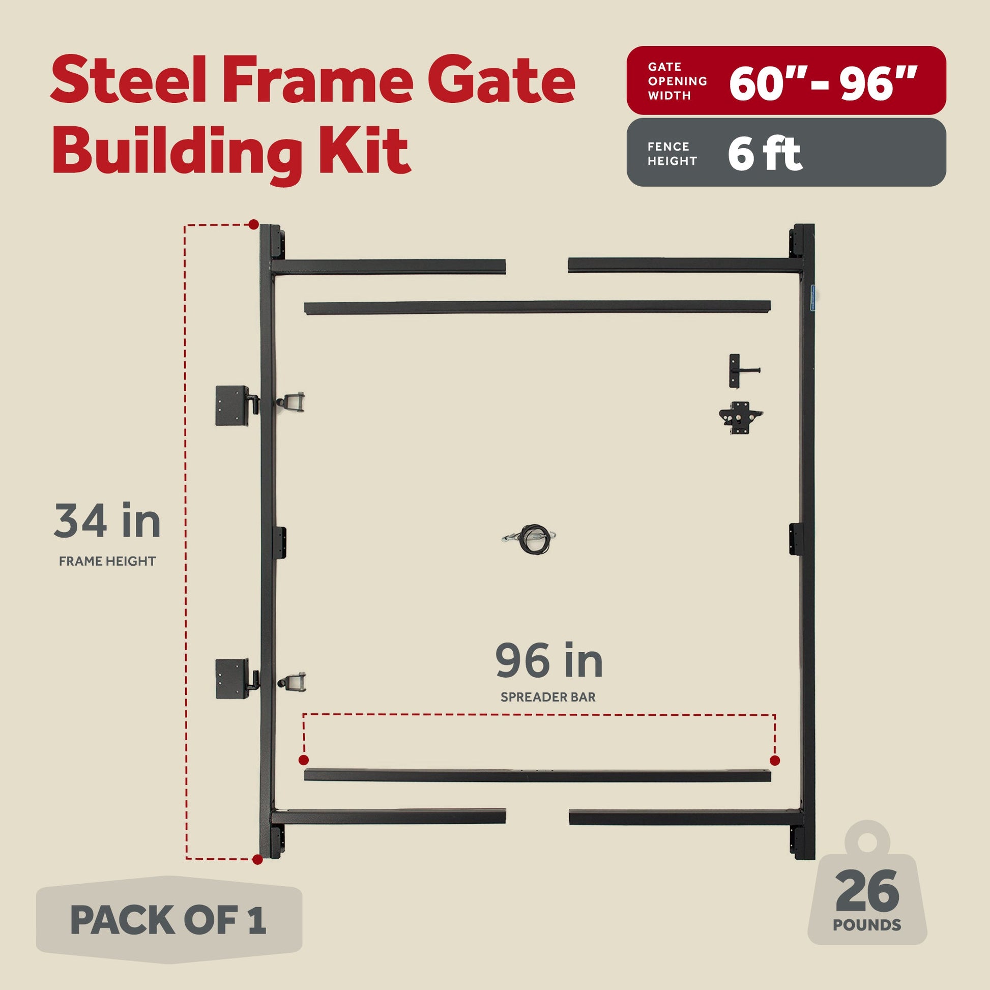 This kit includes a patented truss cable that will keep your gate from sagging or dragging for years to come. You can use it to fix an existing gate or to build a brand new gate up to 96 inches wide. This easy-to-install kit is equipped with all necessary hardware needed to install this system on-site. This kit will fit gate openings that are 60-96 inches wide and fences up to 6 feet high.