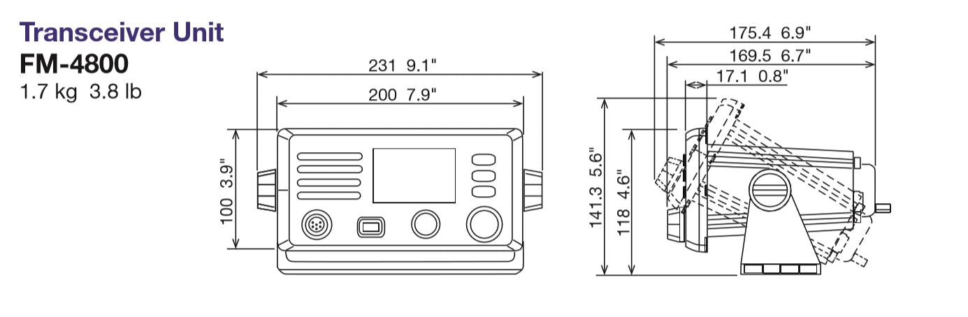 The FM4800 is a marine VHF radiotelephone with built-in Class D DSC, GPS Receiver, AIS Receiver, and Simplified Loud Hailer with intercom. Its compact housing enables it to be installed in a variety of craft, even vessels where space is limited, such as center-console boats. The unit can be mounted on its lightweight bracket, either desktop or overhead, or it can be flush mounted. The FM4800 shares a common appearance with other Furuno equipment, such as NavNet TZtouch2, NavPilot 711C, and the FI70 Instrument series, offering an integrated appearance to any helm.