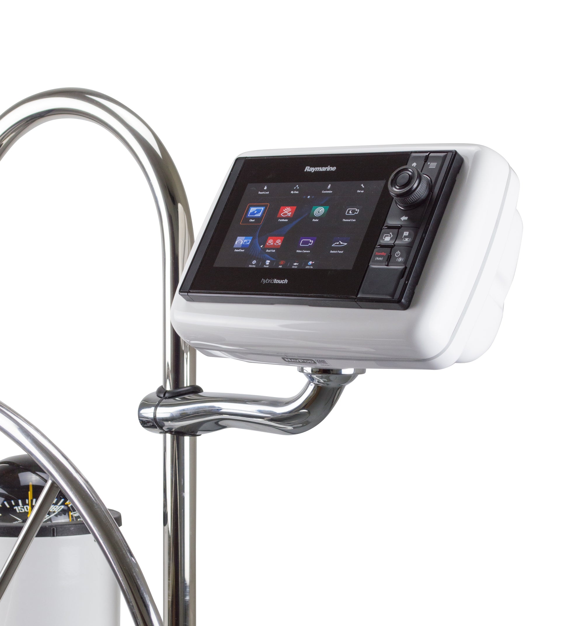 RailMount NavPods are best used for mounting of an autopilot control, sailing instrument, or small chartplotter onto an existing pedestal guard. Fits onto any 1" or 1.25" diameter tube. A Nickel Chrome-Plated Stainless Steel arm is used to mount a NavPod. The NavPod can rotate 180 degrees for easy viewing while sitting under the dodger on a rainy day. All wiring runs from the NavPod, down the center of the stainless steel arm, and into the pedestal guard. This application provides a clean and sturdy installation for electronics, without replacement of the pedestal guard.
