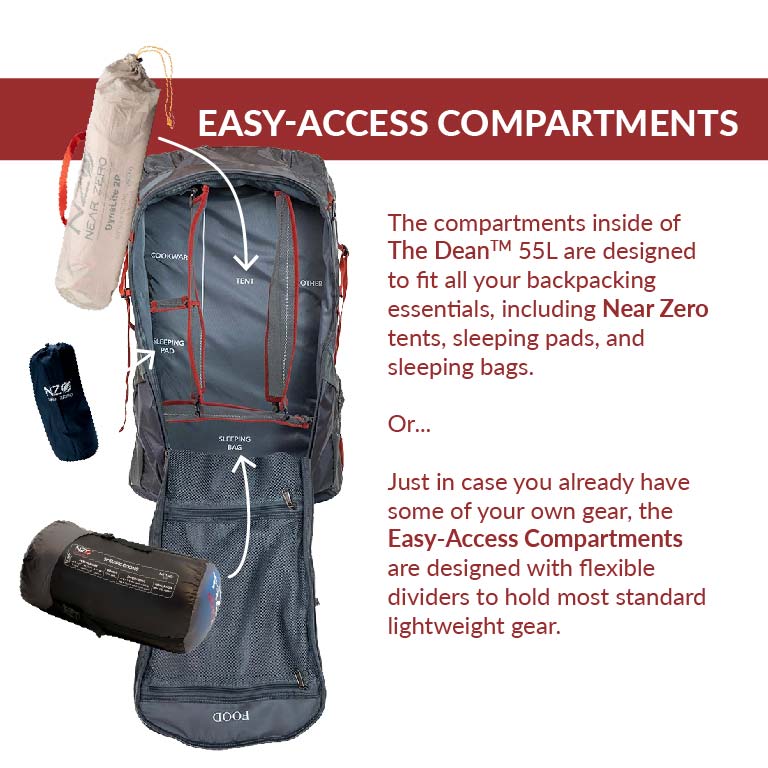 THE DEAN™ 55L by Near Zero is an ultra-lightweight (only 3.8 lbs), large capacity adjustable torso pack for overnight backpacking adventures. Near Zero’s patent-pending design delivers quick access to gear using a labeled, compartmentalized & removable organizational storage system to maximize stability, comfort, and weight distribution.