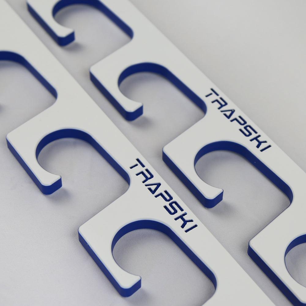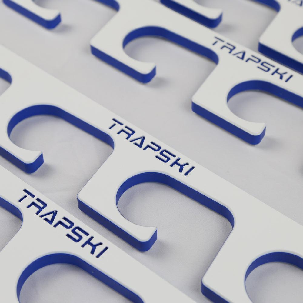 The TRAPSKI Premium Wall Fishing Rod Rack was designed by Angler's for Angler's! Whether you fish the deep sea or your local honey hole, keeping your gear organized and protected is important. It is made with Thick 1/2 inch Marine Grade HDPE in White/Blue/White and comes with Stainless Steel hardware so you can mount it on a wall or ceiling 16 on center in your garage, shed, storage area, boat or outside if you want! The simple design can handle Deep Sea, Inshore or Freshwater rods or combos!