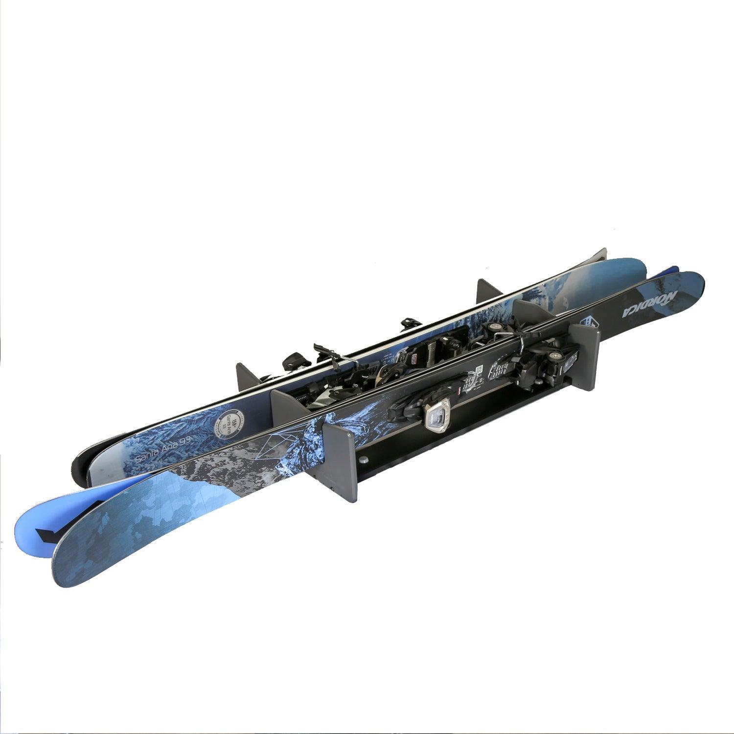 The TRAPSKI TRAVELER rack in Charcoal, holds 2 pairs of skis & poles inside an air Travel bag with a 12 inch or bigger width inside.