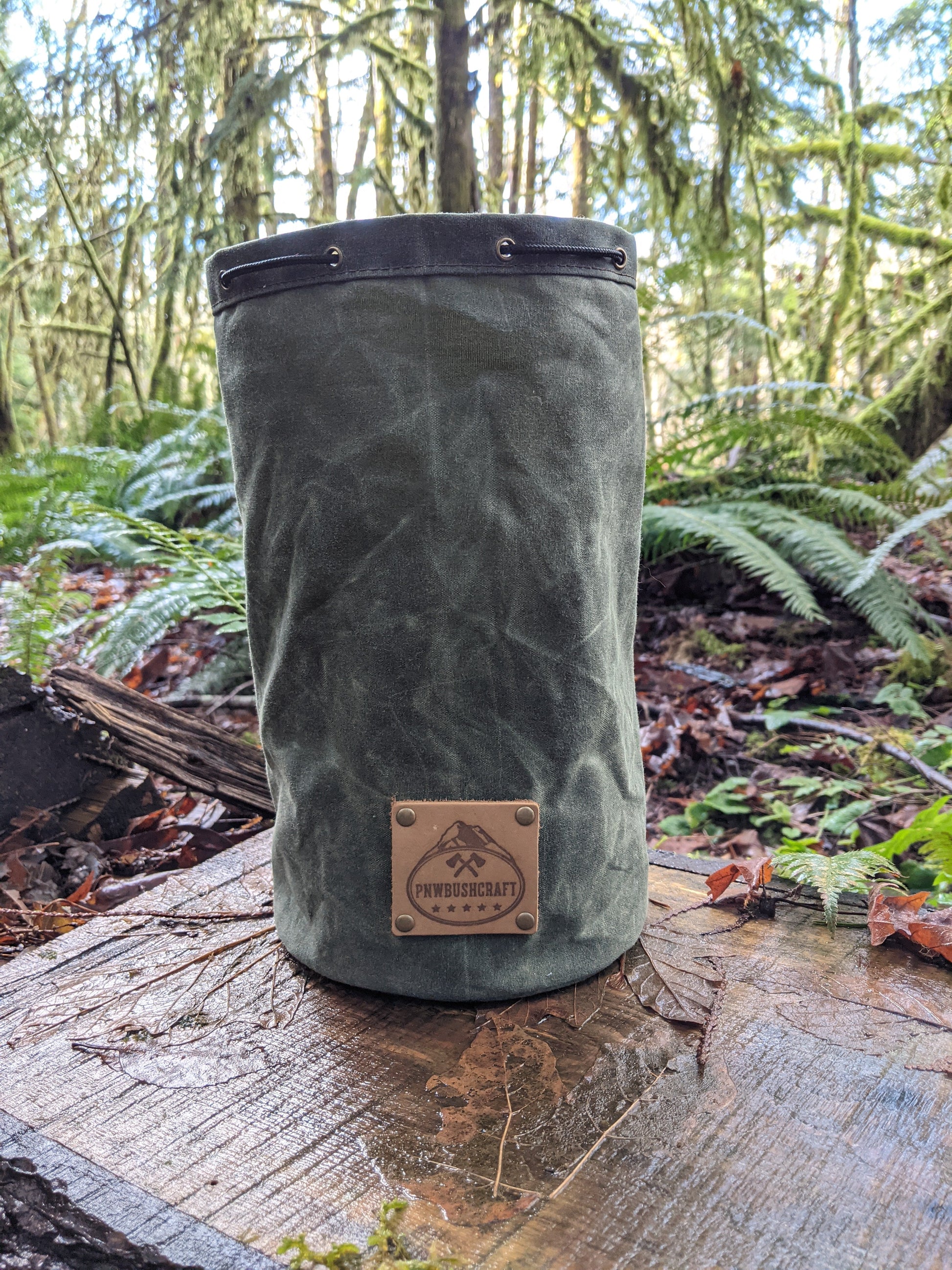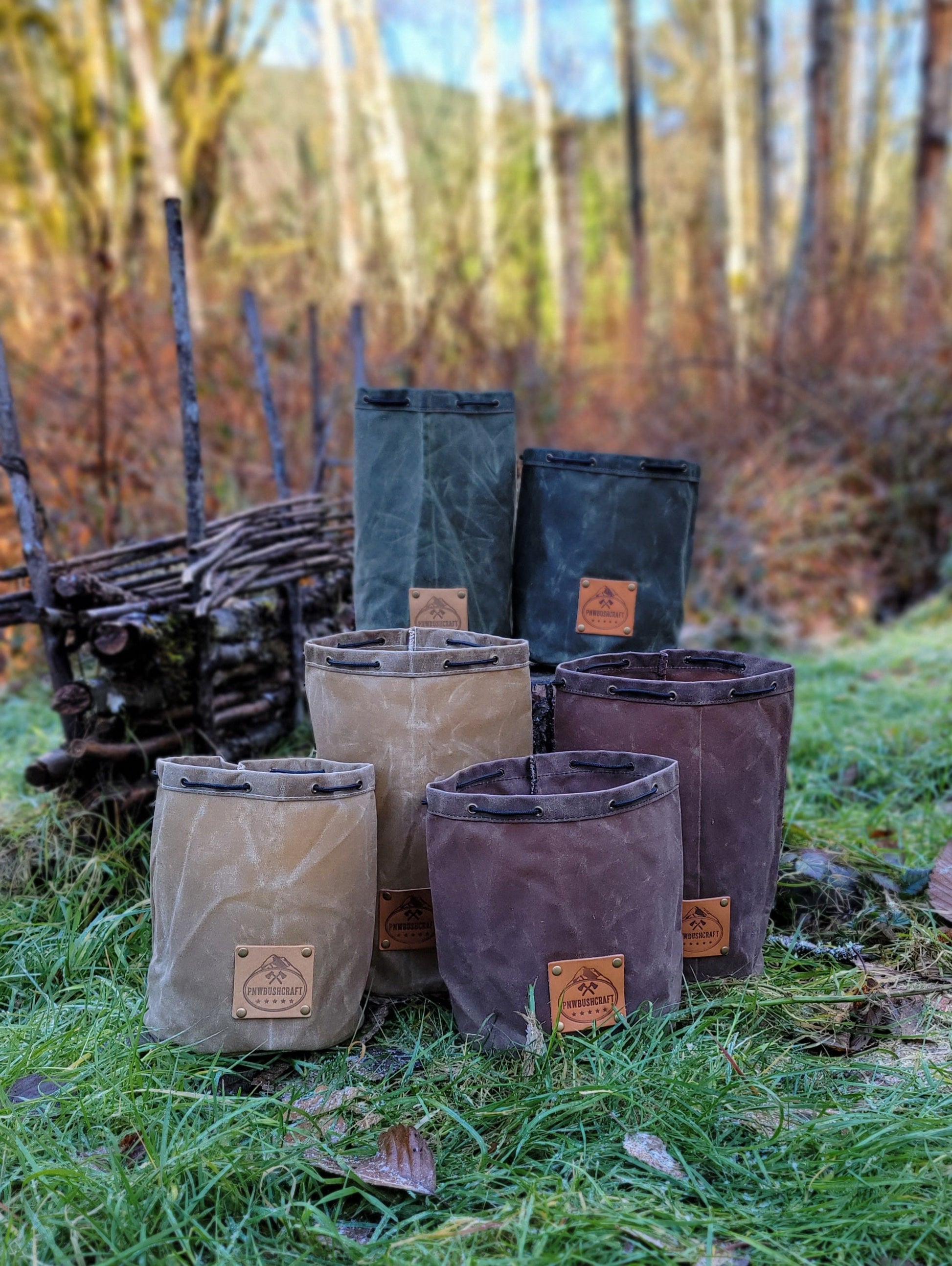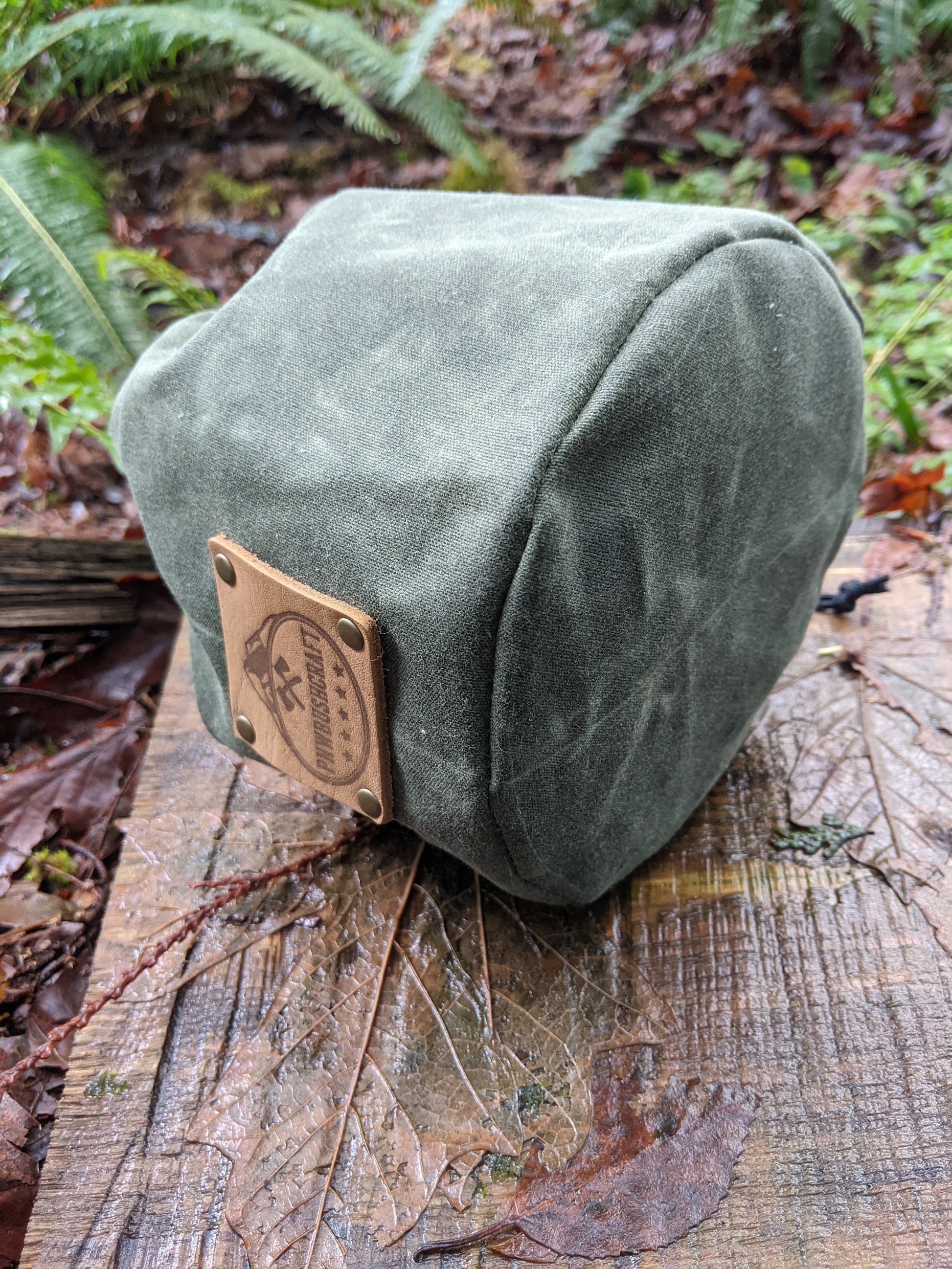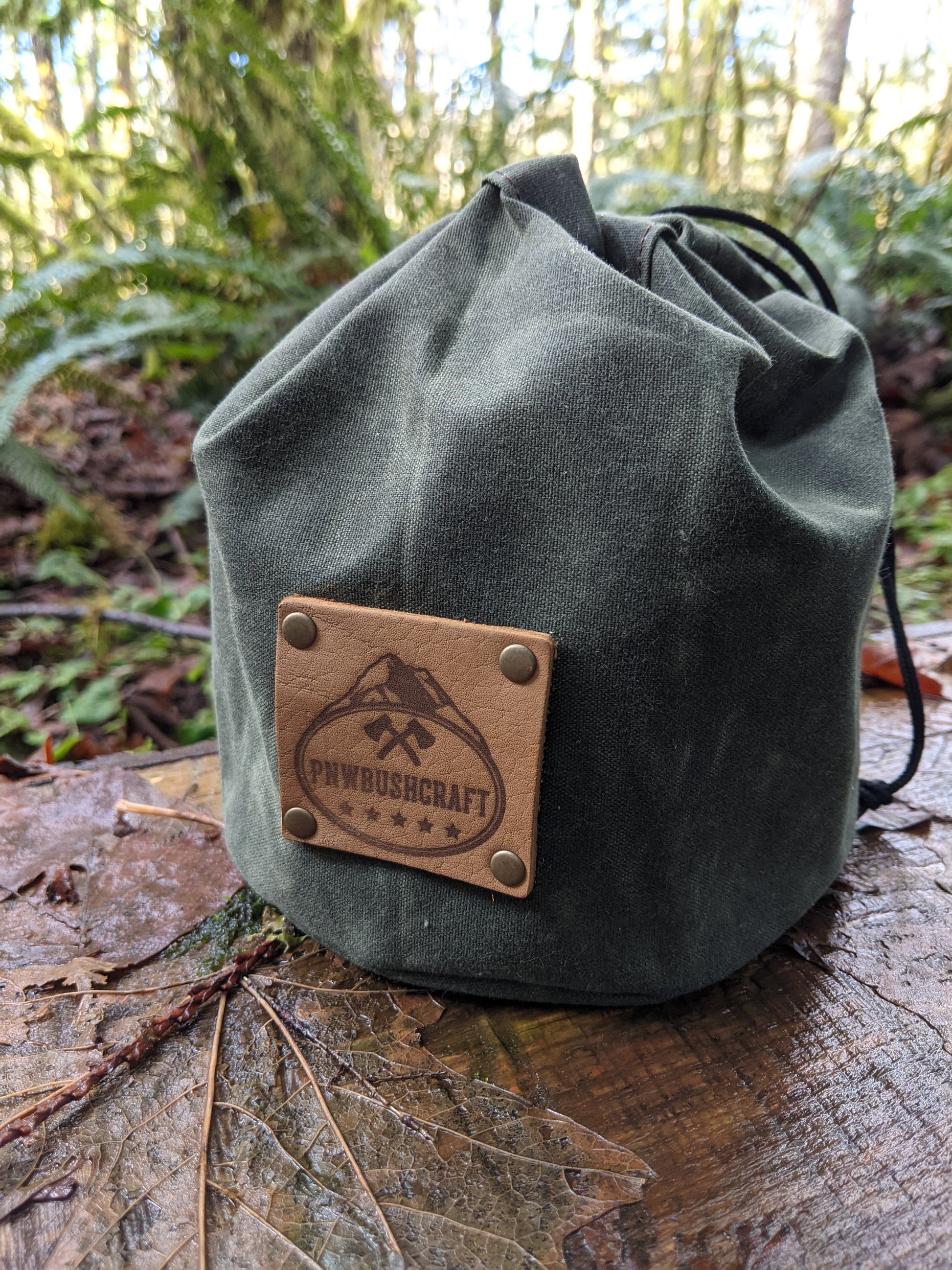 The bag is made of 10.1 oz waxed canvas which holds up great to the elements. This bag was designed to hold a cook set. It comes in a dark brown, olive green, field tan, and pulls shut with paracord and a toggle. This was created to be a traditional Bushcraft item but has so many uses. You can put so many different items in here. We use one for our cooking set so the rest of our gear doesn't get dirty. This is a great addition to any backpack or a gift for that outdoor enthusiast you know.