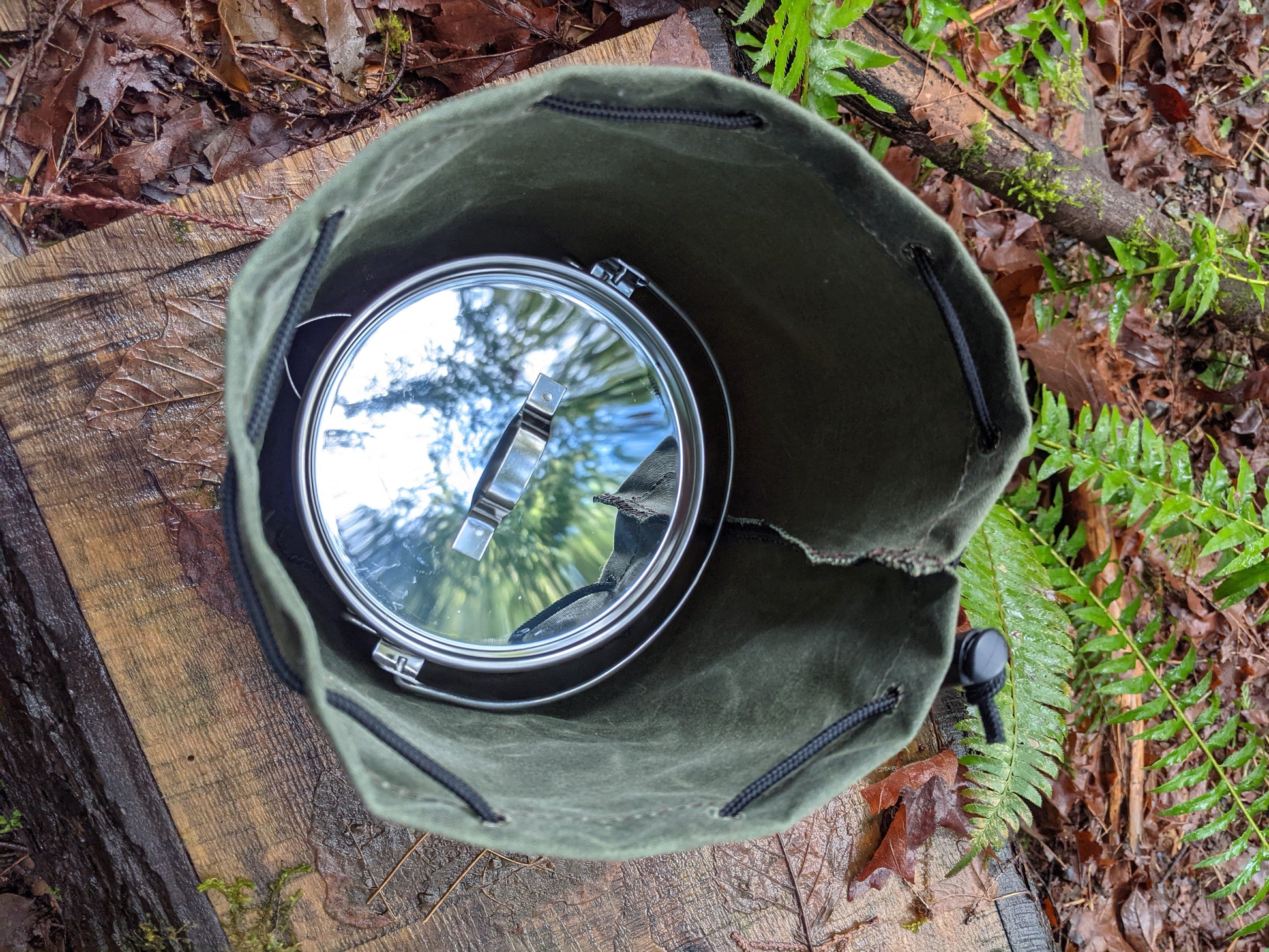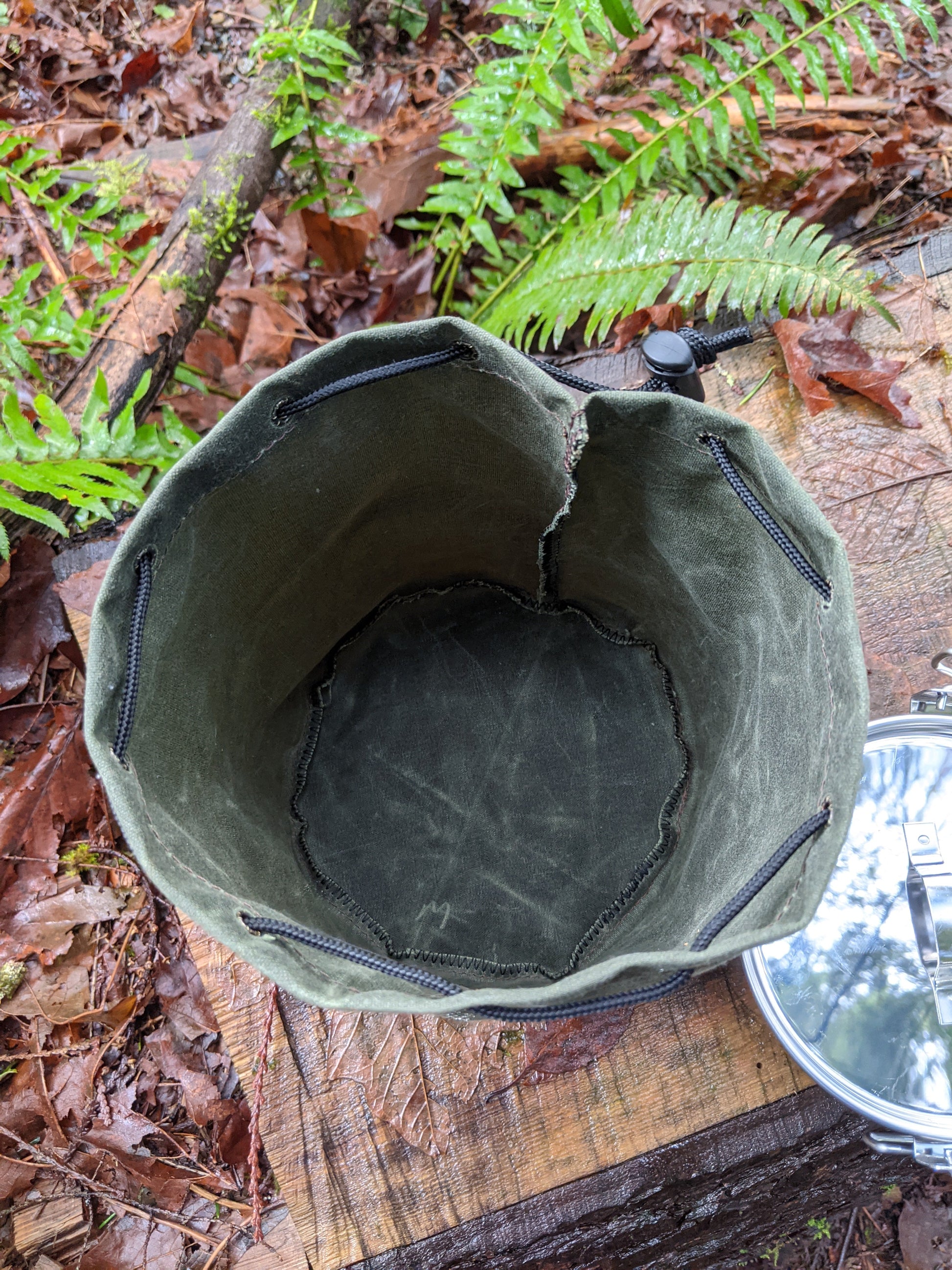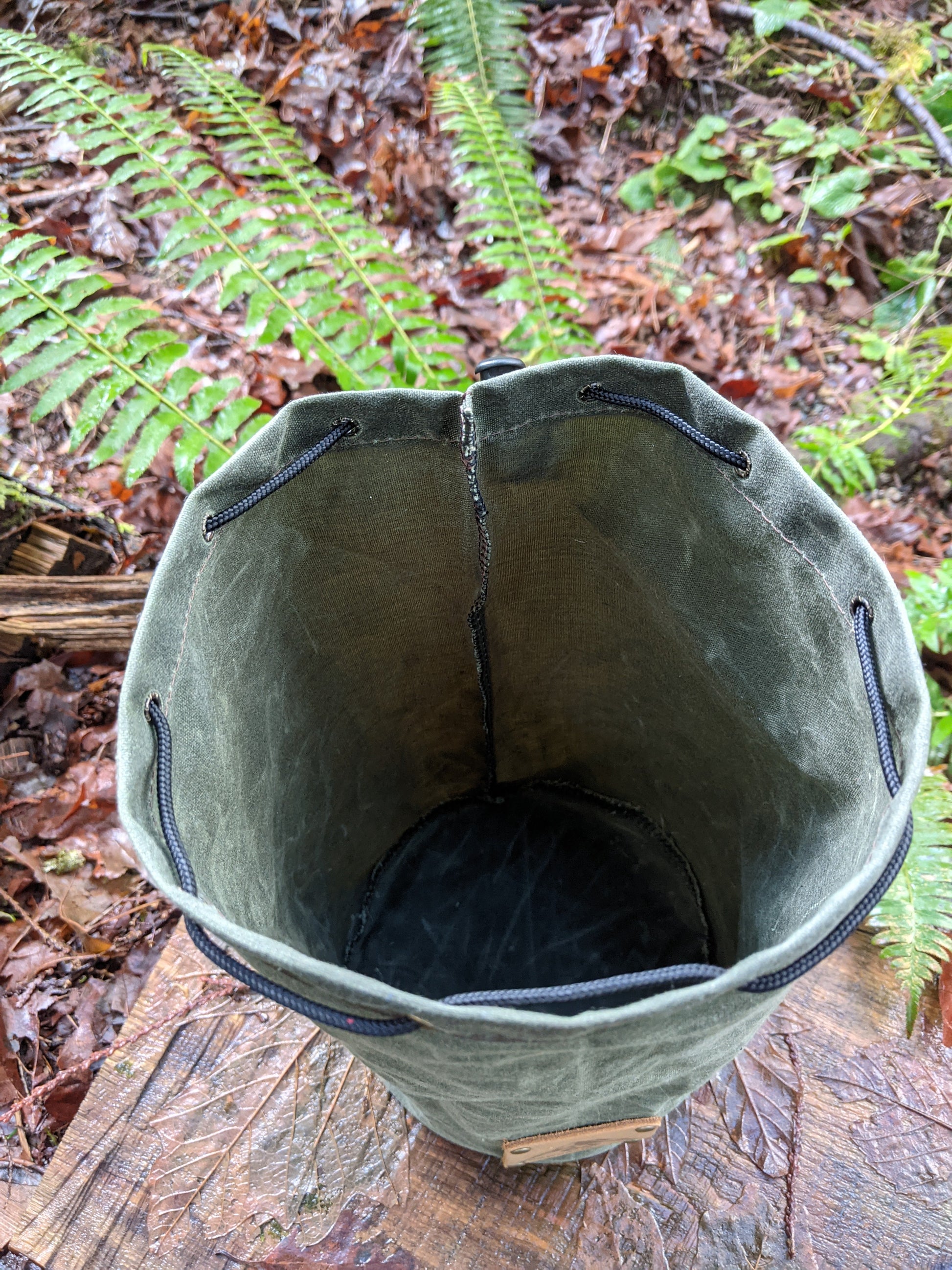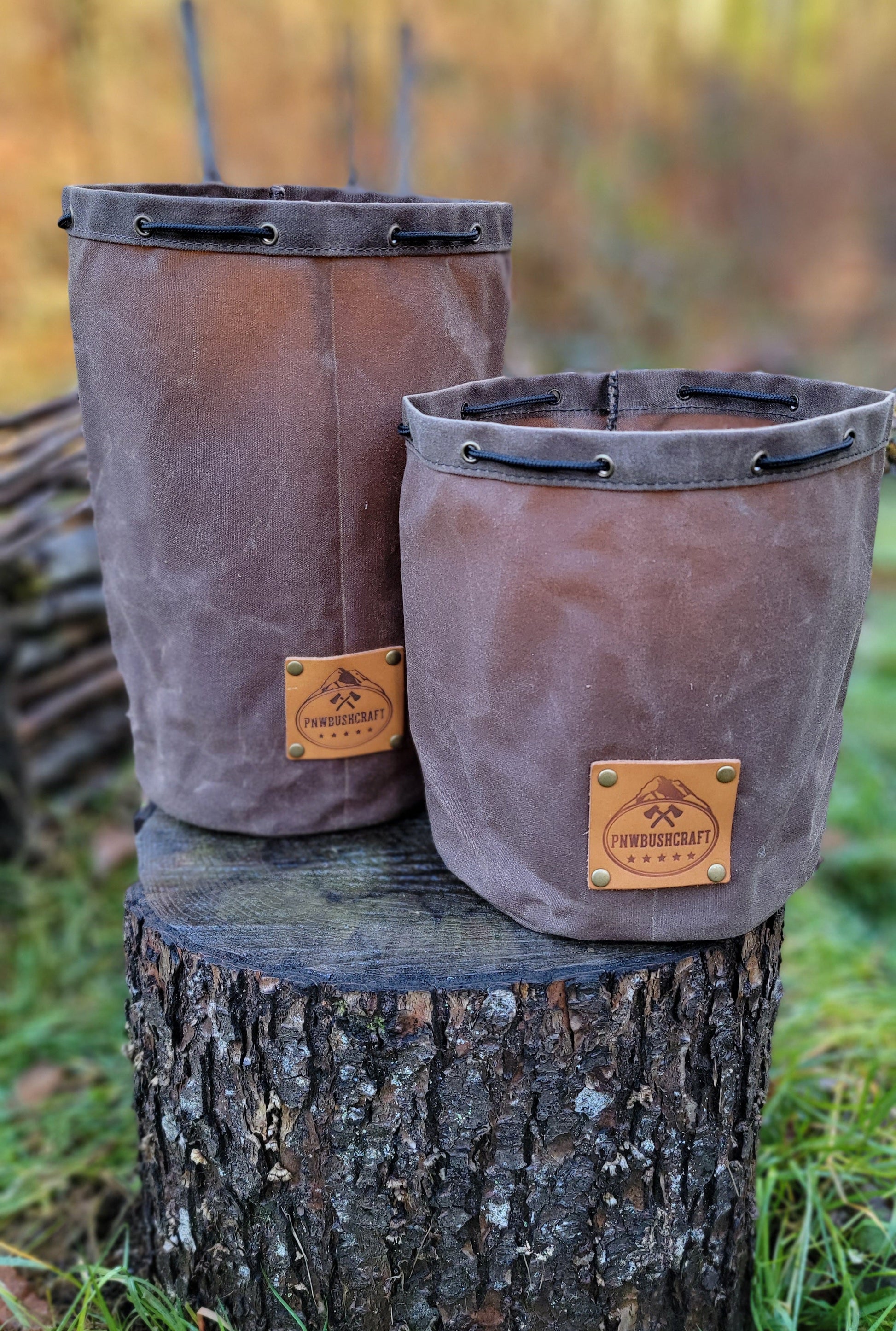 The bag is made of 10.1 oz waxed canvas which holds up great to the elements. This bag was designed to hold a cook set. It comes in a dark brown, olive green, field tan, and pulls shut with paracord and a toggle. This was created to be a traditional Bushcraft item but has so many uses. You can put so many different items in here. We use one for our cooking set so the rest of our gear doesn't get dirty. This is a great addition to any backpack or a gift for that outdoor enthusiast you know.